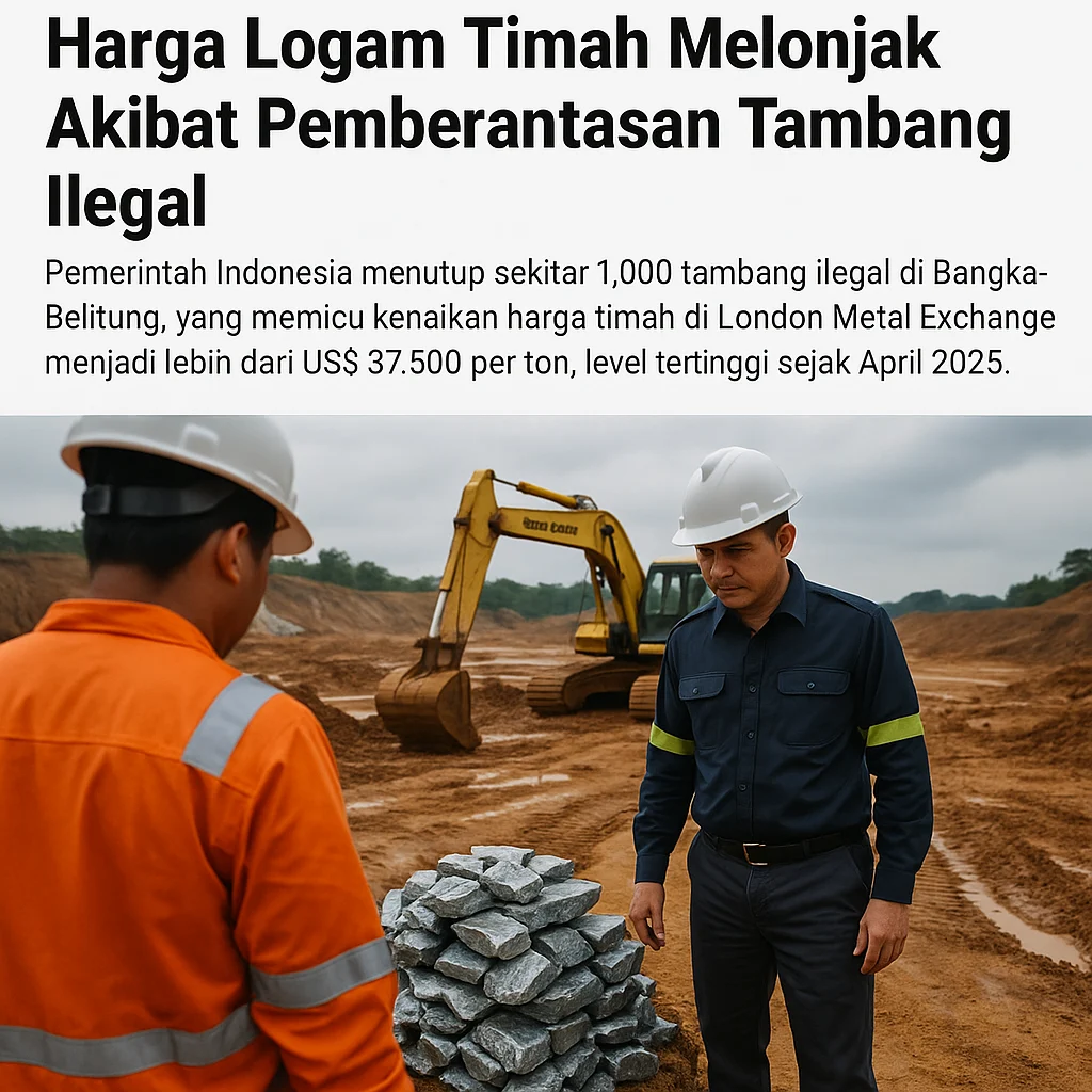 Harga logam timah dunia melonjak tajam setelah Pemerintah Indonesia melakukan langkah besar menertibkan sekitar 1.000 tambang ilegal di wilayah Bangka Belitung. Penutupan tambang liar ini membuat pasokan global berkurang drastis, sehingga harga timah di London Metal Exchange (LME) menembus lebih dari US$ 37.500 per ton, tertinggi sejak April 2025.