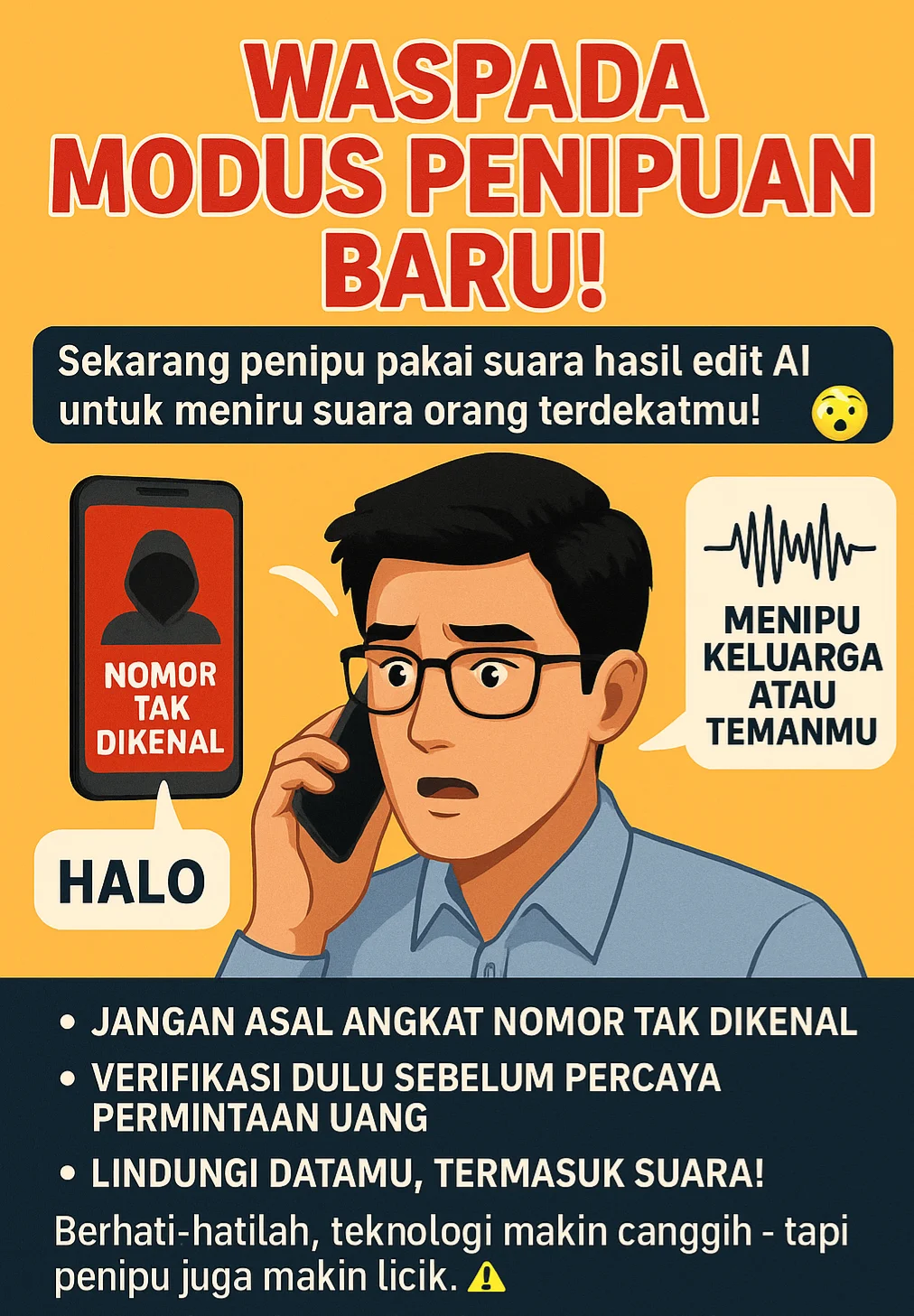 Jakarta — Masyarakat diimbau untuk waspada terhadap modus penipuan baru yang kini marak beredar di berbagai daerah. Modus ini memanfaatkan teknologi kecerdasan buatan (AI) untuk meniru suara korban dan digunakan dalam aksi penipuan terhadap orang-orang terdekatnya.